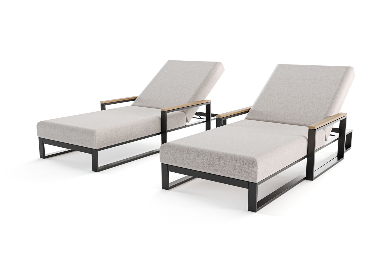 Due eleganti lettini prendisole con dettagli in teak e comoda imbottitura Quick Dry - riposarsi con stile come in un resort di lusso.