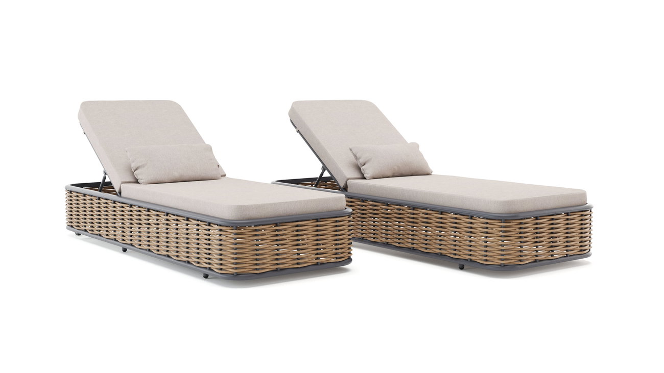 Ogni lettino dispone di una robusta struttura in alluminio di alta qualità verniciato a polvere, che garantisce durata e resistenza alle intemperie. Le strutture sono elegantemente avvolte con polyrattan rotondo da 1 cm, che conferisce al set una texture pregiata e un aspetto leggero e arioso che si integra armoniosamente in qualsiasi ambiente esterno.