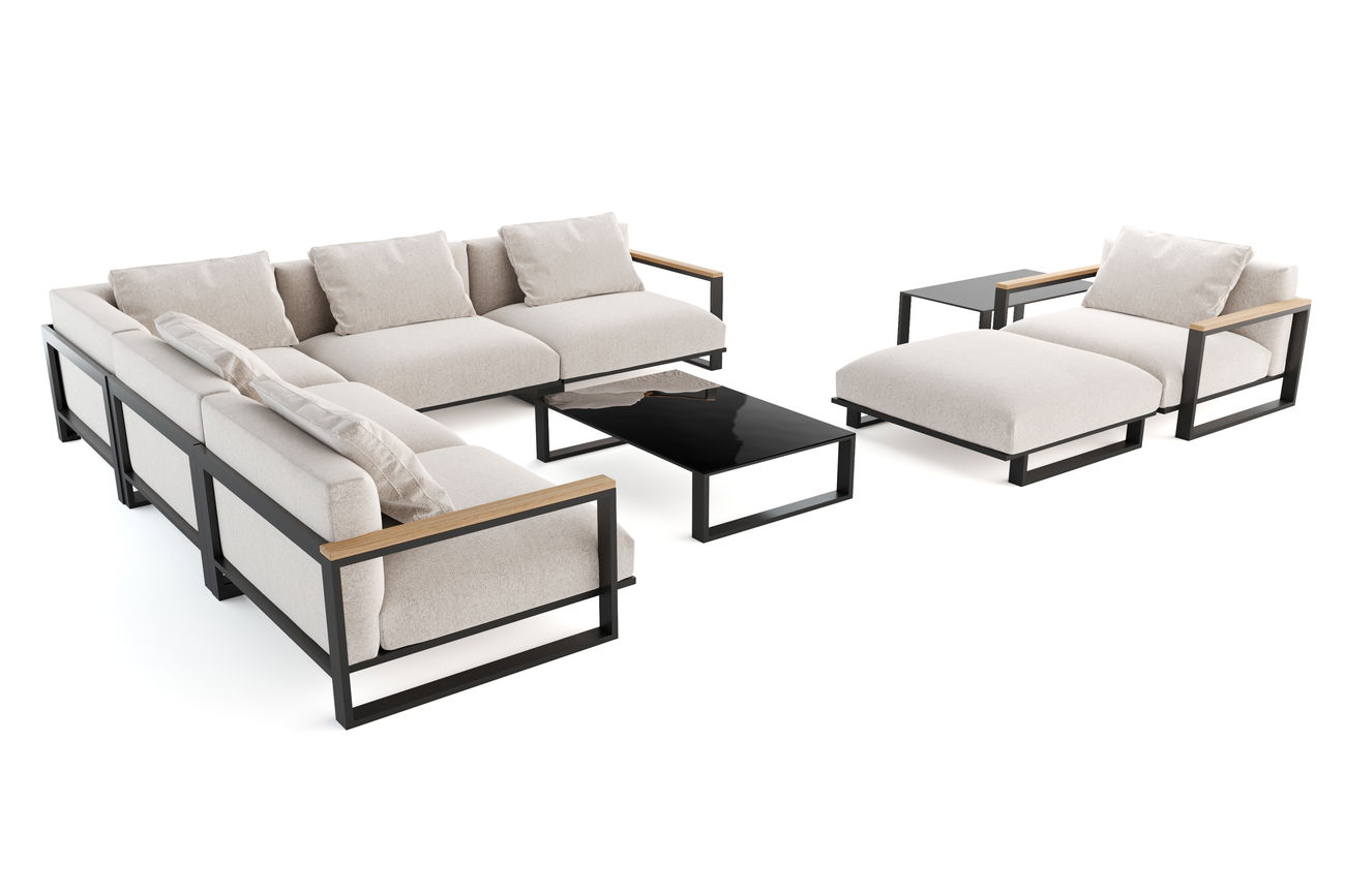 Il salotto Matoyo è realizzato in alluminio accuratamente lavorato con finitura verniciata antracite, che non solo offre un aspetto accattivante, ma garantisce anche durata e resistenza agli elementi. I braccioli della poltrona e dell'elemento angolare con bracciolo sono artisticamente rifiniti in caldo legno di teak, creando un elegante connubio tra natura e modernità.