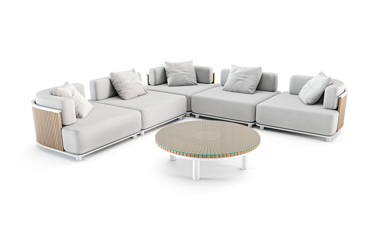 Il tavolino da salotto, realizzato in alluminio verniciato a polvere, riprende abilmente il linguaggio formale delle sedute. Il piano del tavolo in listelli di teak artisticamente disposti, completato da un piano in vetro trasparente, aggiunge un ulteriore tocco di eleganza e rende il tavolo il punto d'incontro centrale del vostro salotto.
