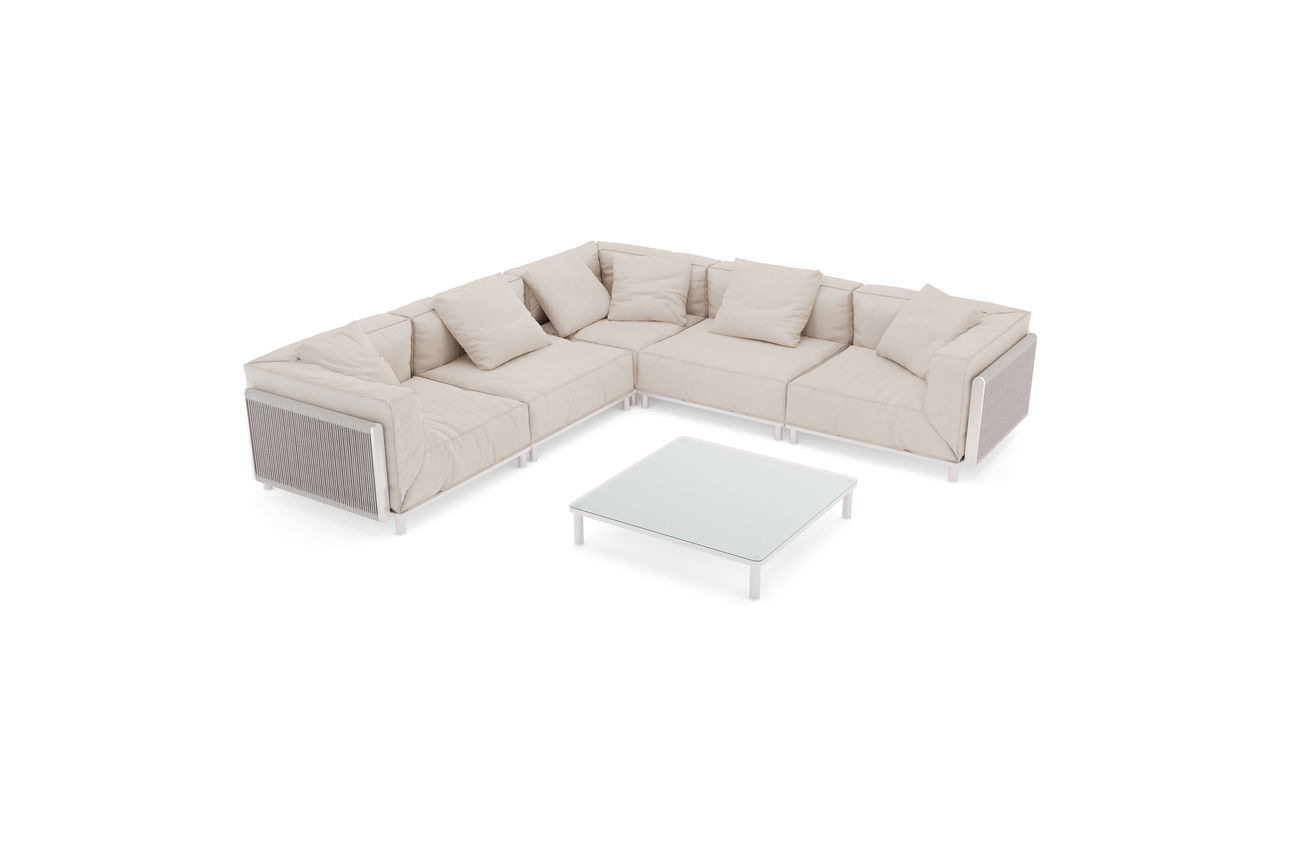 La struttura del salotto è realizzata in alluminio durevole verniciato a polvere nel nobile colore Light Champagne. Questa superficie non è solo robusta e resistente alle intemperie, ma conferisce anche al set un'elegante e discreta presenza. I braccioli e gli schienali sono artisticamente intrecciati con una corda chiara, che conferisce al design leggerezza e raffinatezza.
