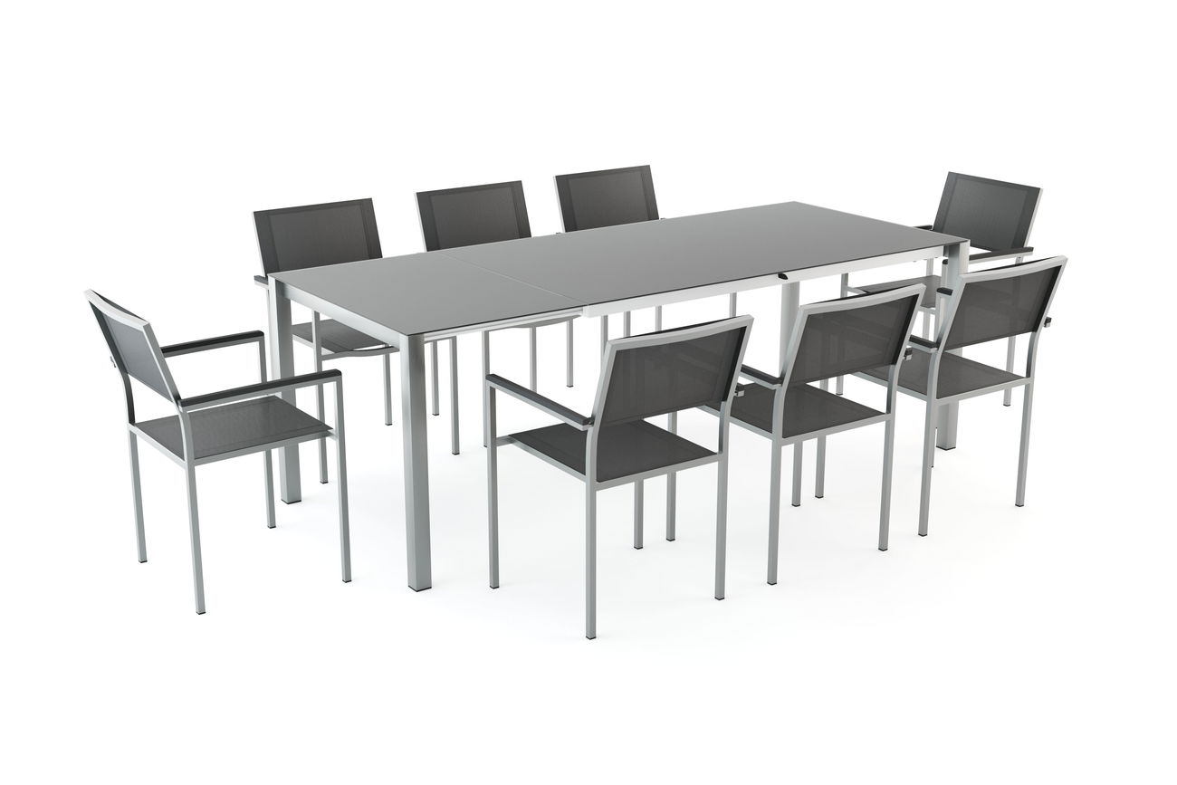 Il set è completato dal tavolo allungabile, che con la sua struttura in acciaio inossidabile di alta qualità e l'elegante piano in vetro scuro aggiunge un tocco di raffinatezza al vostro terrazzo. La sua dimensione è adattabile, estensibile da 160 cm a 220 cm, offrendovi flessibilità per diverse occasioni e rappresentando allo stesso tempo il palcoscenico perfetto per le vostre esperienze culinarie all'aperto.