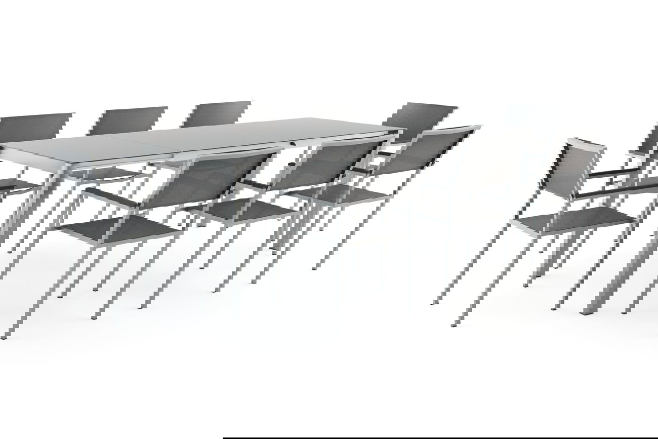 Il set è completato dal tavolo estensibile, che con la sua struttura di alta qualità in acciaio inossidabile e l'elegante piano in vetro scuro porta un tocco di raffinatezza alla vostra terrazza. La sua dimensione è adattabile, estensibile da 160 cm a 220 cm, offrendovi flessibilità per diverse occasioni e rappresentando allo stesso tempo il palcoscenico perfetto per le vostre esperienze culinarie all'aperto.