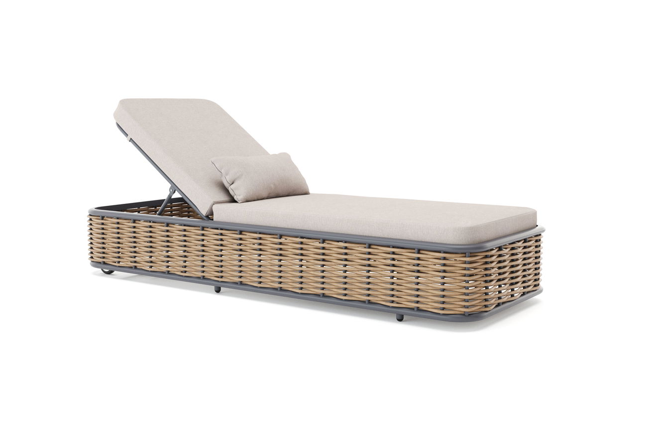 La struttura robusta è realizzata in alluminio di alta qualità verniciato a polvere, durevole e resistente alle intemperie. Il telaio è elegantemente avvolto con intreccio rotondo da 1 cm. La base simile al rattan conferisce al lettino una texture nobile e un aspetto leggero e arioso che si armonizza perfettamente con qualsiasi ambiente esterno.