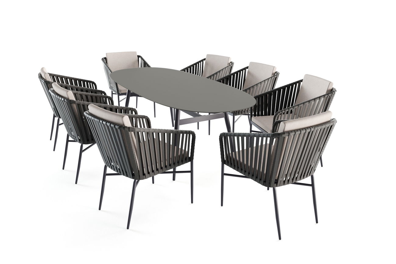 Le otto comode sedie, che pesano solo circa 5 kg ciascuna, sono dotate di cuscini per seduta e schienale in schiuma spessi 5 cm. Questi garantiscono una sensazione di seduta piacevole, che rende confortevoli anche le lunghe serate estive in ottima compagnia. La robusta struttura in alluminio verniciato a polvere è inossidabile e resiste a tutte le condizioni atmosferiche, garantendo un uso duraturo. Le gambe del tavolo resistente con un diametro di 6 cm offrono stabilità aggiuntiva.