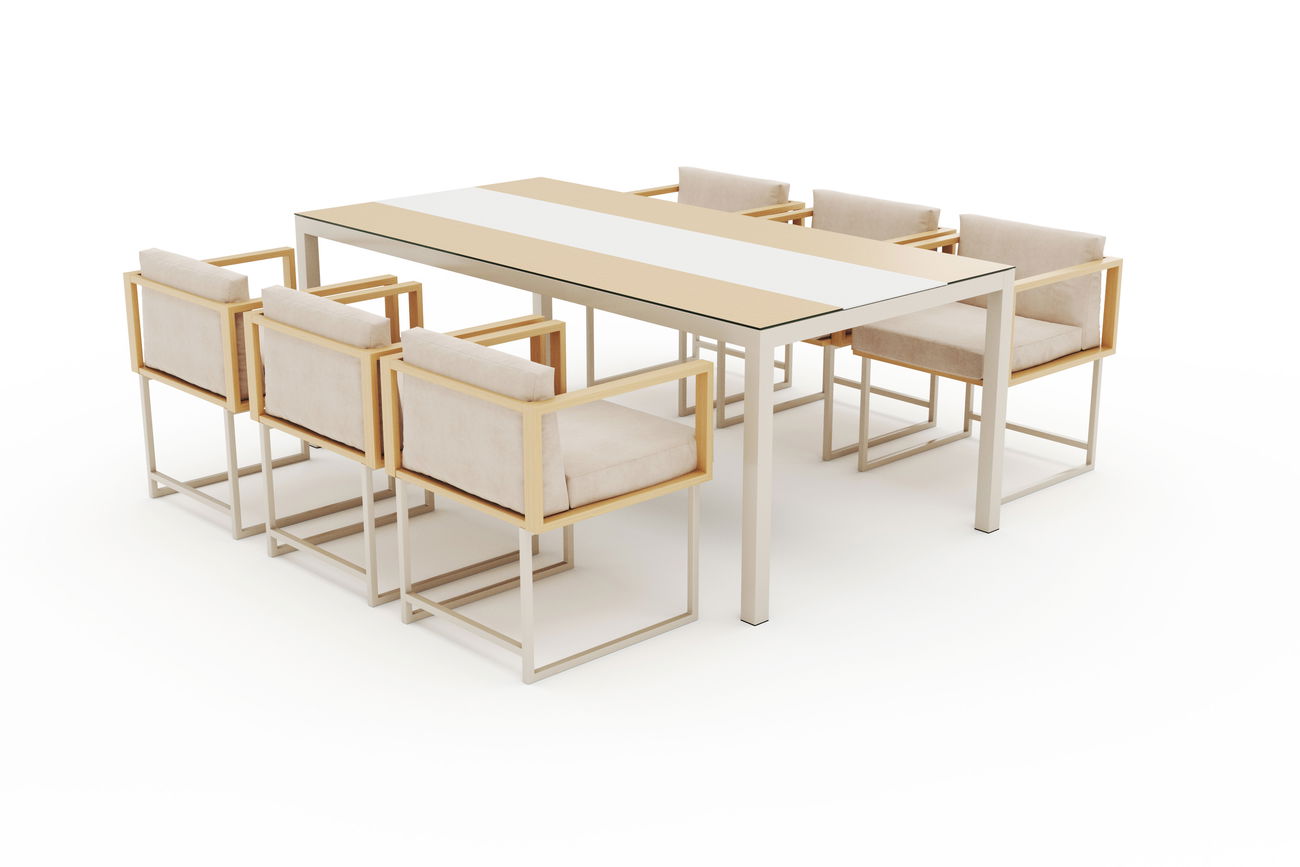 La combinazione di una robusta struttura in alluminio con un elegante rivestimento effetto legno conferisce al set un aspetto naturale e allo stesso tempo moderno. Il piano del tavolo accuratamente lavorato in materiale di alta qualità si distingue per la sua durabilità e la superficie facile da pulire. Le eleganti gambe del tavolo color champagne creano un contrasto armonioso e completano il design con stile.