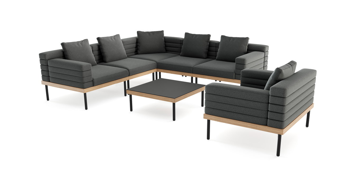 Rivestita con il tessuto Obsidian di un nero profondo, la Luma Lounge Light Plus porta una nota moderna ed elegante in ogni ambiente outdoor. La superficie opaca satinata incontra linee chiare – ridotte, ma mai fredde. I moduli liberamente combinabili vi offrono libertà nella progettazione: dall'isola relax ariosa alla Lounge comunicativa per lunghe notti estive.
