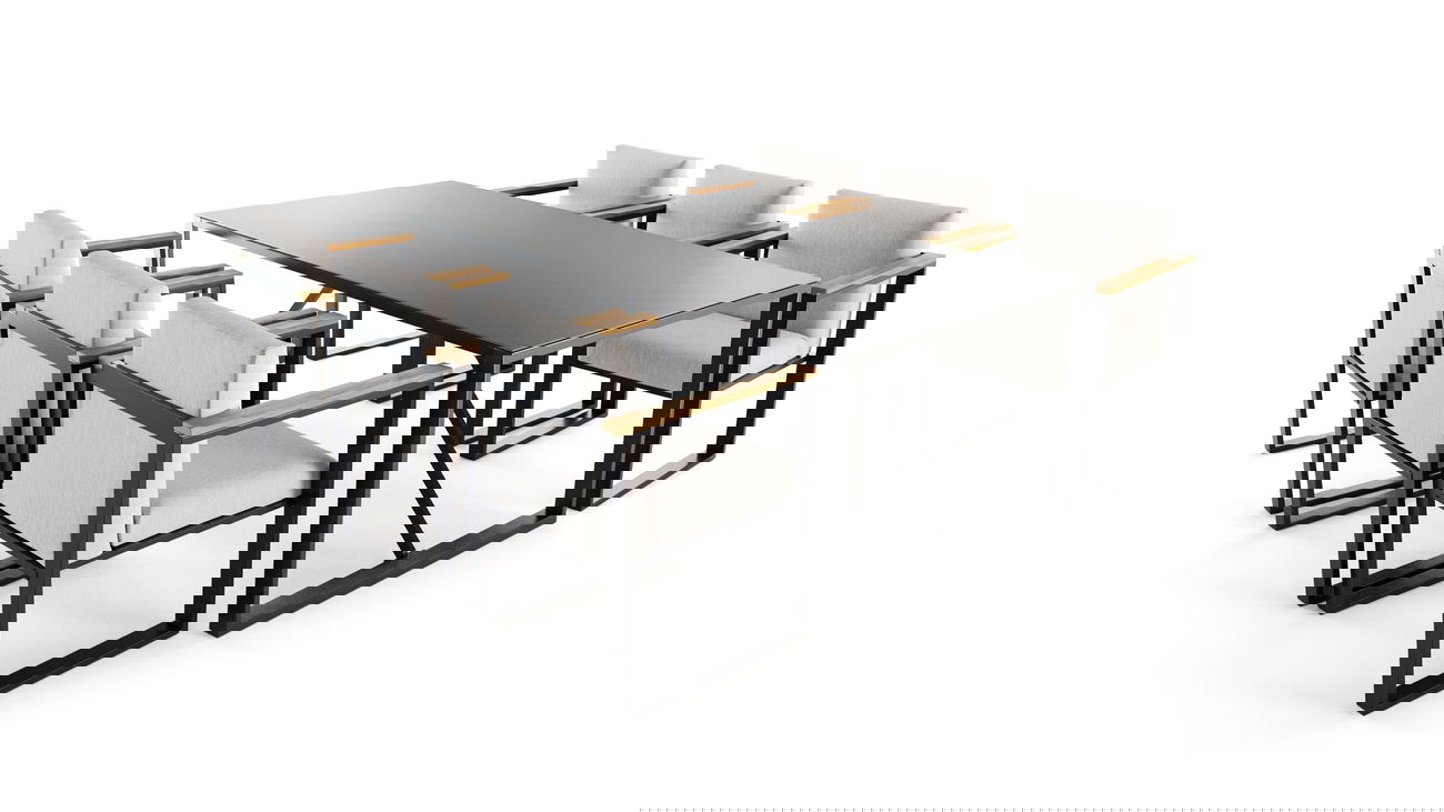 La struttura in alluminio verniciato a polvere in elegante antracite conferisce al gruppo Matoyo Dining un'eleganza moderna e cubica.