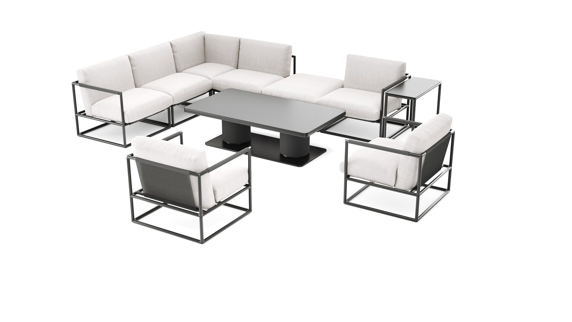 La struttura in alluminio verniciato a polvere è inossidabile e stabile, i cuscini sono realizzati in tessuto di poliestere di alta qualità, idrorepellente e facile da pulire. Gli elementi decorativi in corda nera garantiscono texture e tattilità sottili. Tutti i materiali sono accuratamente selezionati, in modo che la Lounge rimanga elegante e confortevole anche con un uso intensivo.