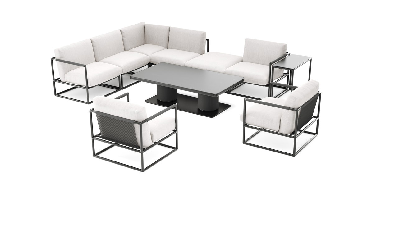 Il Verso Lounge Max sviluppa un linguaggio di design grafico e architettonico in una composizione chiaramente ordinata. La struttura in alluminio color antracite forma telai geometrici ampiamente estesi, la cui estetica cubica crea un'immagine complessiva strutturata. Le linee chiare appaiono moderne e volutamente ridotte e conferiscono all'insieme una presenza sovrana e tranquilla nell'Außenbereich – come una Lounge di stile da un hotel di lusso nel proprio giardino.
