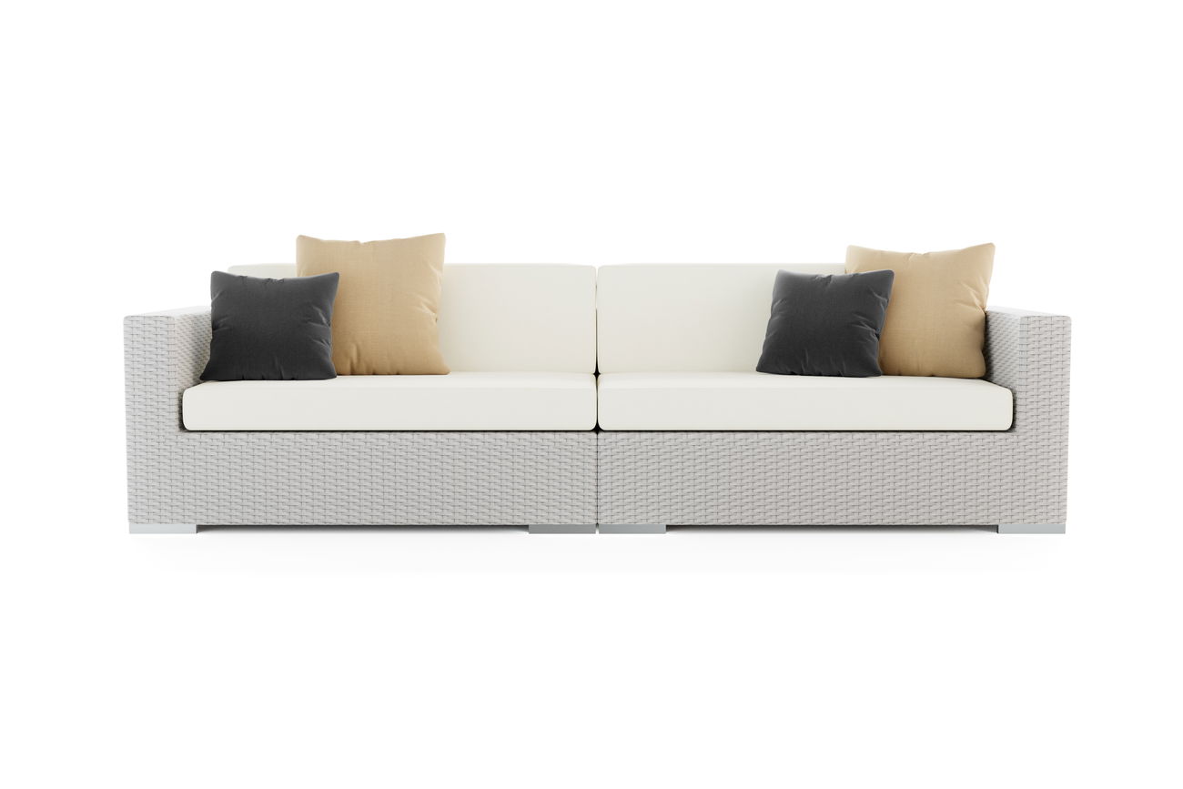 La struttura stabile del divano Cube è garantita da un telaio in alluminio verniciato a polvere, che non solo è antiruggine e resistente alle intemperie, ma offre anche una capacità di carico fino a 120 kg per posto a sedere. I braccioli e le angolazioni larghi 15 cm, così come i piedi rivestiti in plastica con copri-piedi in alluminio effetto acciaio inox, sottolineano l'estetica di alta qualità del set.