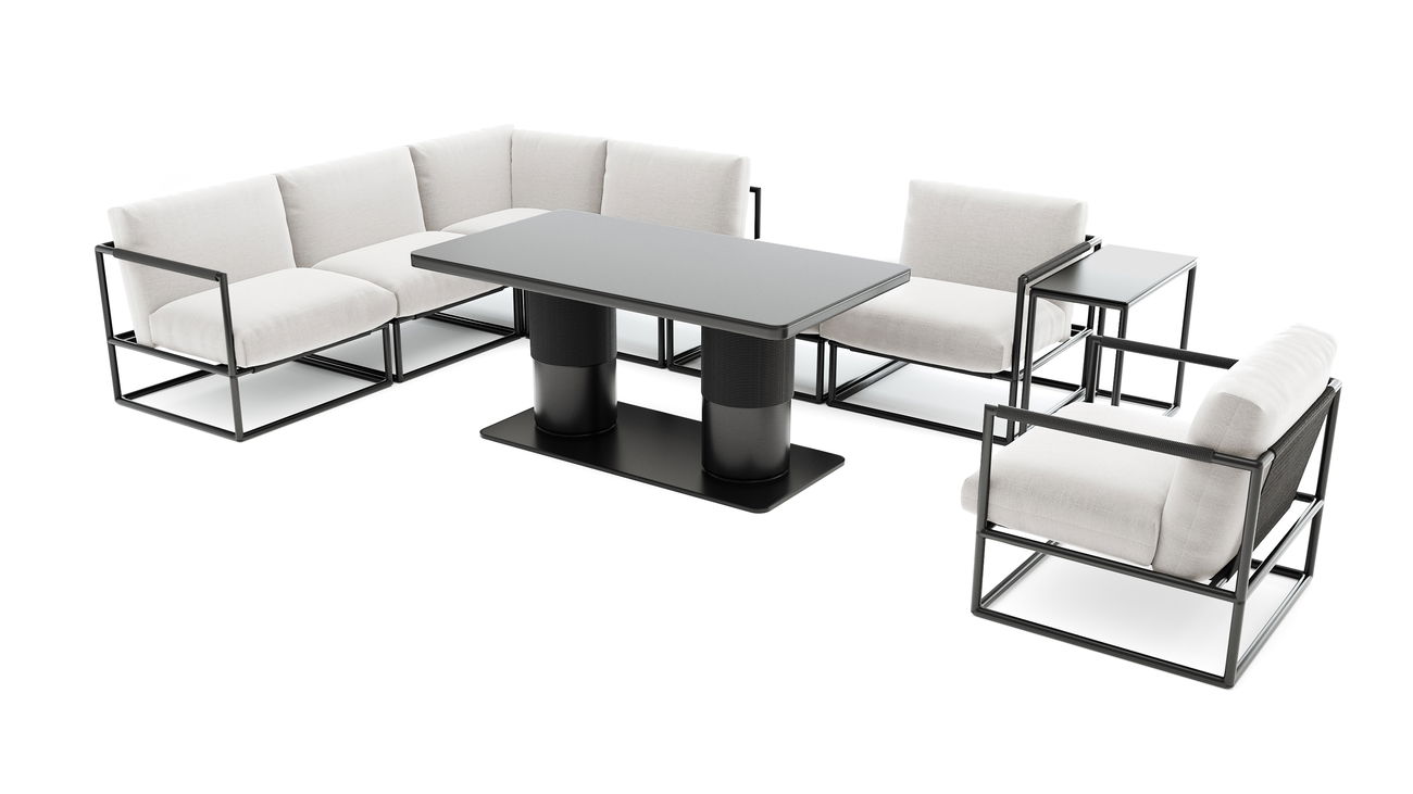 Verso Lounge Plus presenta un design outdoor dalle linee nette, definito dall’estetica cubica e lineare della struttura in alluminio color antracite. L’ordine grafico dei telai crea una presenza moderna e strutturata, al tempo stesso leggera e non invadente.